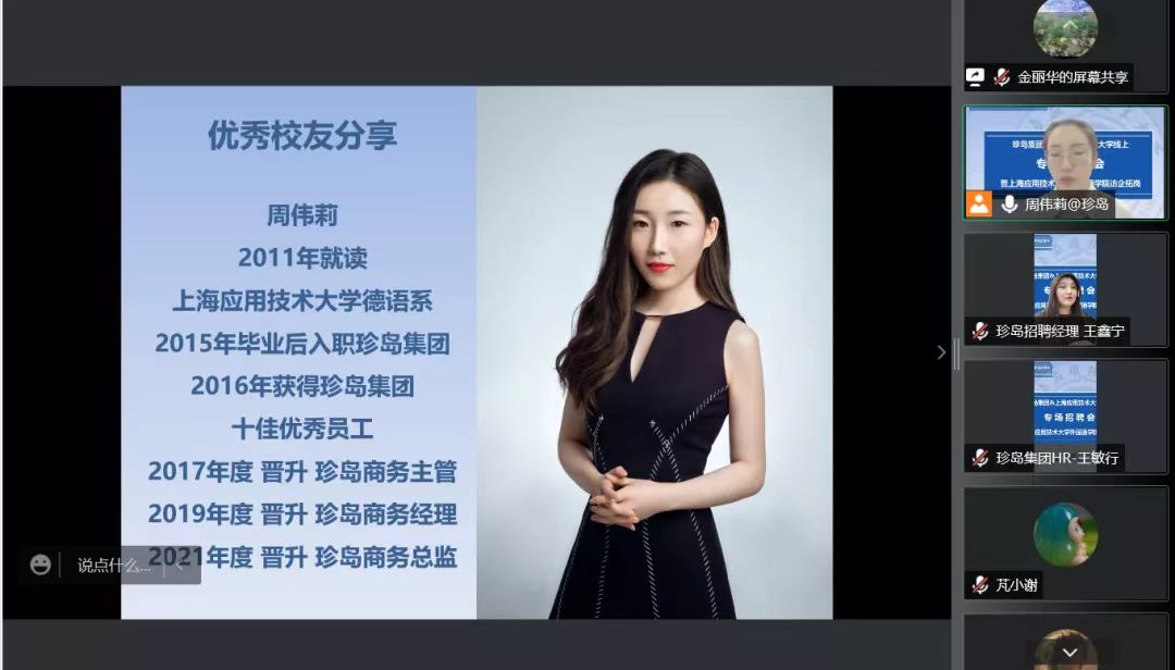 外国语学院党总支书记李晓晶、外国语学院院长潘智丹、外国语学院副书记副院长金丽华,珍岛集团上海大区区域总监叶焱、商务总监周伟莉、人力资源部招聘经理王鑫宁、招聘专员王敏行出席会议,外国语学院全体辅导员及2022年应届毕业生参加了该活动。