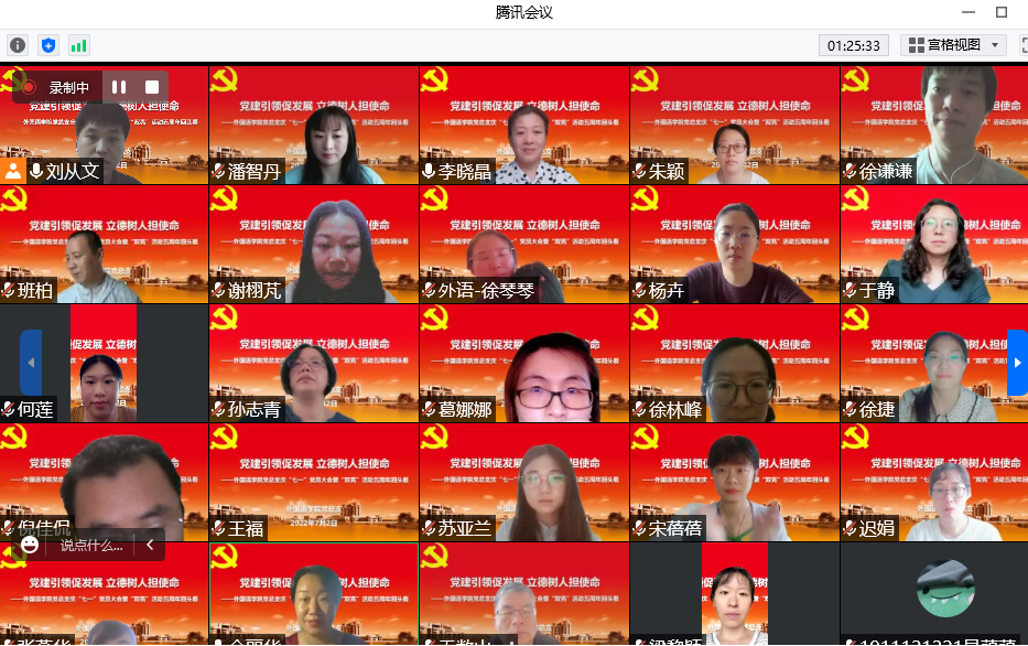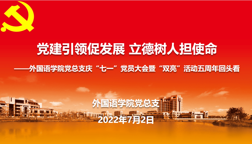 为庆祝中国共产党成立101周年,7月2日,外国语学院党总支通过腾讯会议举办了“党建引领促发展·立德树人担使命——庆‘七一’全体党员大会暨‘双亮’活动五周年回头看主题党日”活动。外国语学院党总支书记李晓晶、院长潘智丹、副书记副院长金丽华、副院长孙志青及全体师生党员参加了本次活动。活动由金丽华主持。