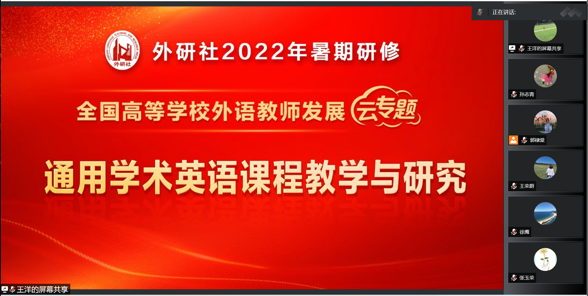 全国高等学校外语教师发展云专题是外语教学与研究出版社举办的2022年度暑期全国外语教师“云研修”活动,“通用学术英语课程教学与研究”是其系列专题之一。孙志青作为发言专家,与来自中国科学院大学、中国人民大学、华南理工大学、华北电力大学等高校的专家齐聚一堂,围绕学术英语课程建设与教学实践展开研讨和交流,展示了学院大学英语教学改革的丰硕成果。