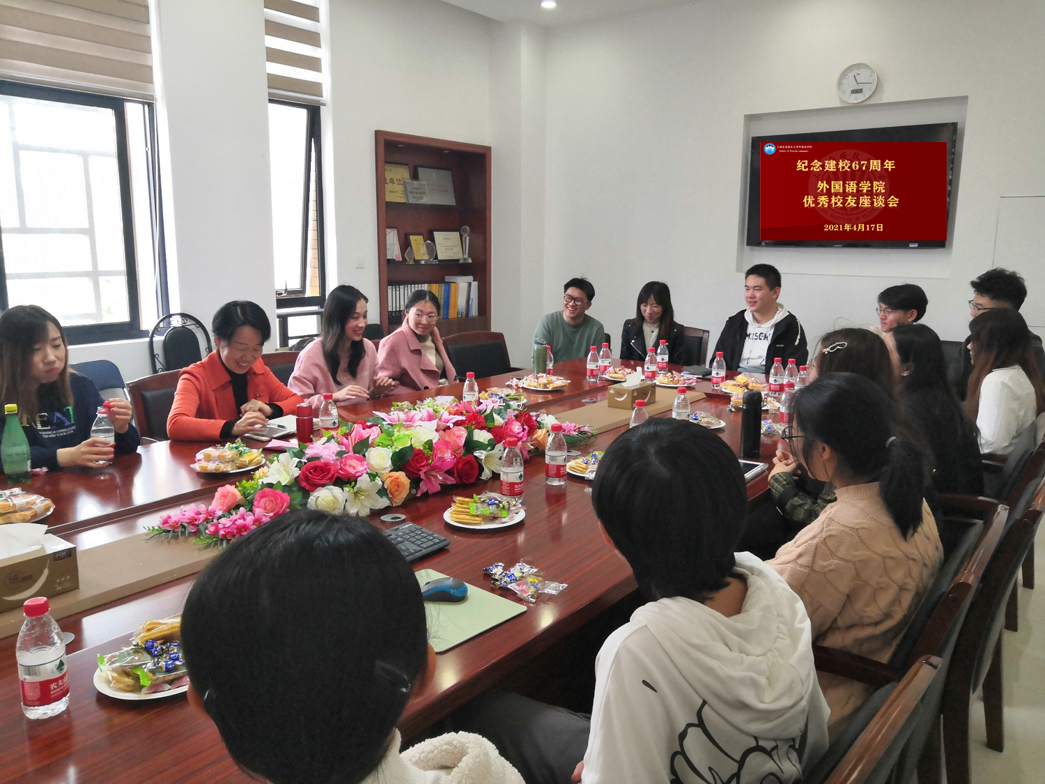 为迎接建校67周年,外国语学院于4月17日上午10:00,在五科B213会议室召开优秀校友座谈会,由外国语学院副书记副院长金丽华主持,优秀校友代表和在校生代表参加了座谈会。