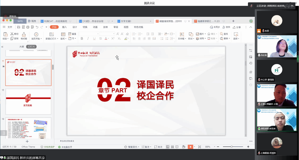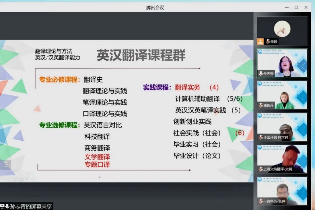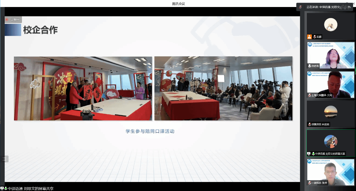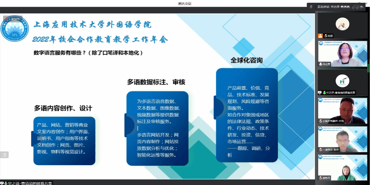 Sun introduced the faculty structure of the SFL, the curriculum of translation courses, the construction of translation teachers, and the cooperation vision of the enterprise. Focusing on the curriculum construction, practice and graduation design, she analyzed the cooperation points with enterprises, and hoped that the participating enterprises could participate more in the curriculum construction of teaching, so as to provide more opportunities for students to practice.