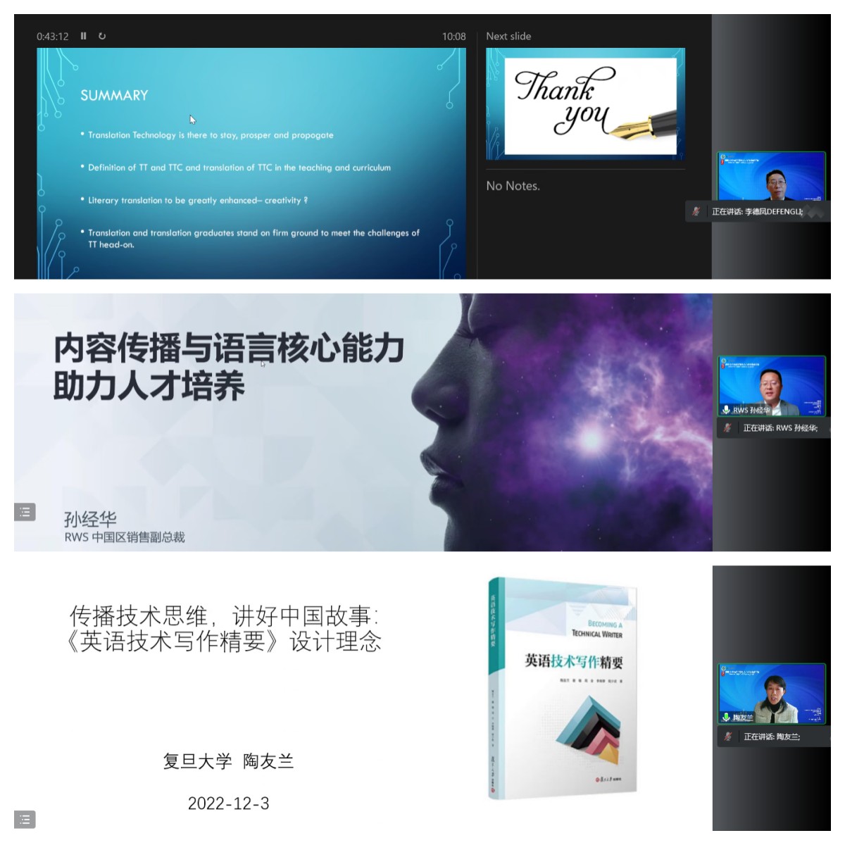 Sun Jinghua, Vice President of Sales in RWS China, put the foothold of translation education on mastering content management technology, that is, translators and interpreters should be capable to use Trados Enterprise to manage translation contents. And he also talked about a rising demand from enterprises for talents with compound capabilities and mastering translation technology, so there would be a brighter prospect for training and hiring these talents. Besides, Professor Li Defong from the University of Macau pointed out that creativity of translators and interpreters was one of the key components of translation technological competence, so cultivating creativity should take a significant role in translation education. What’s more, Professor Tao Youlan from Fudan University discussed textbooks and teaching concepts of English technical writing, based on a design concept in the textbook of Becoming a Technical Writer. She showcased how to improve students’ capabilities in English technical writing and have a better engagement in international communication in the new era.